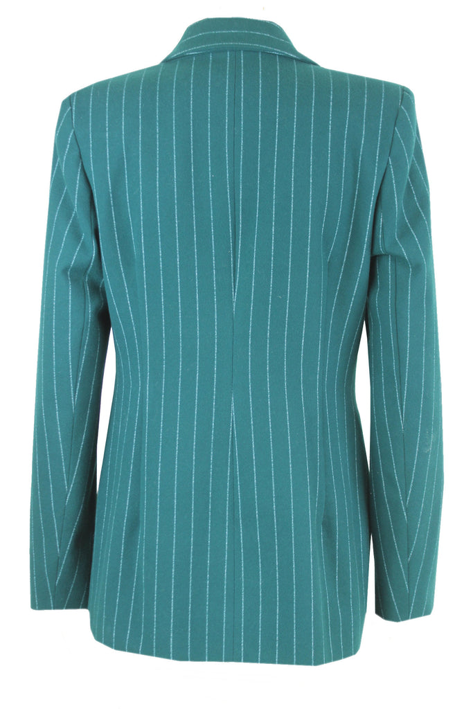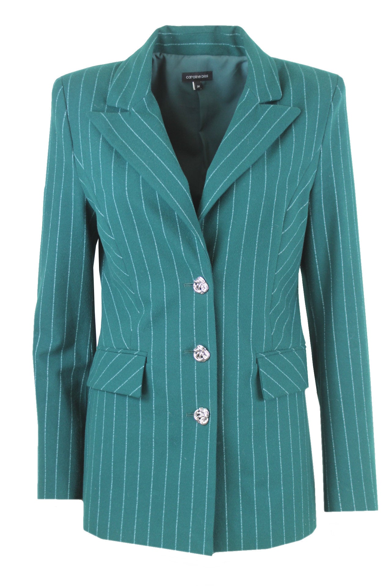 Caroline Biss groene blazer, gevoerd, reverskraag, drie zilverkleurige luxe knopen, twee klepzakken aan de voorkant, schoudervulling