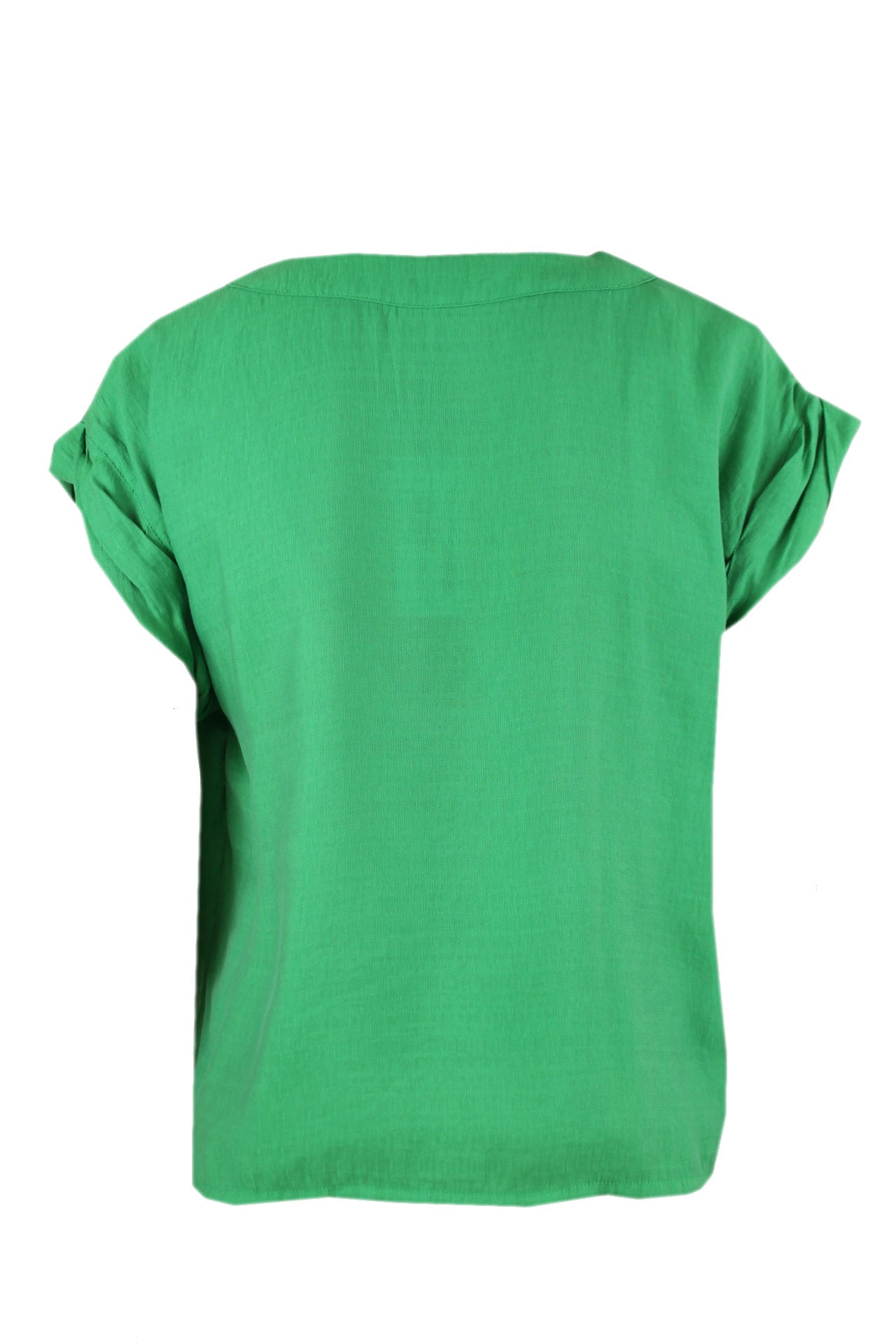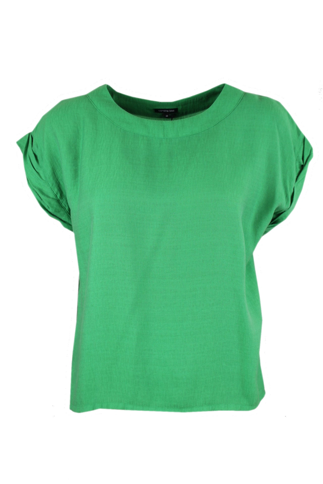 Caroline Biss forestgreen korte blouse, een ronde hals met een bies, armsgat heeft een sieroverslag
