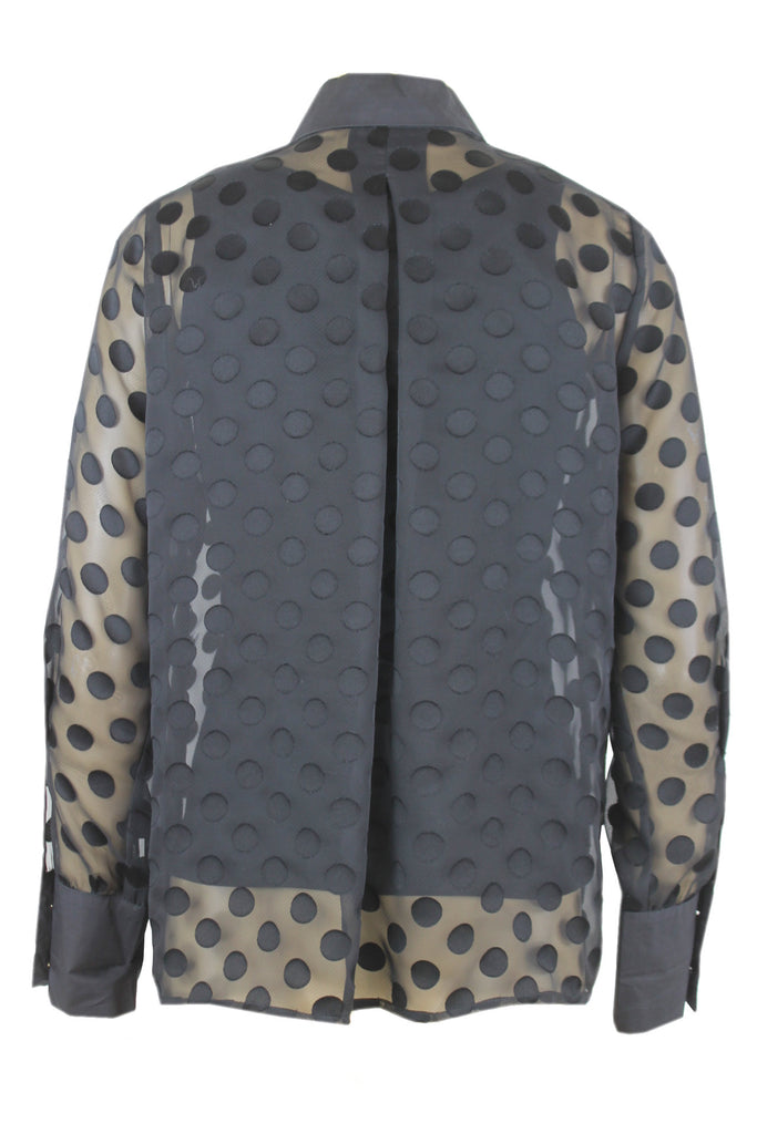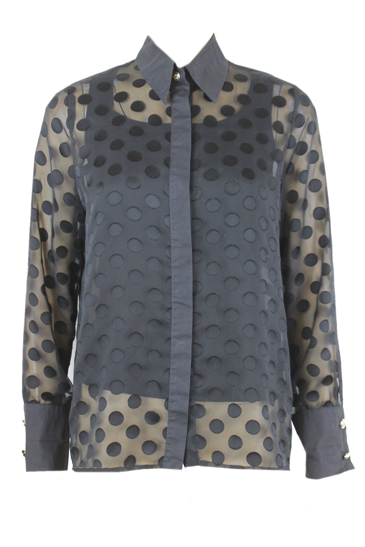 Caroline Biss transparante blouse met zwarte bollen patroon, manchet met twee goudkleurige knopen