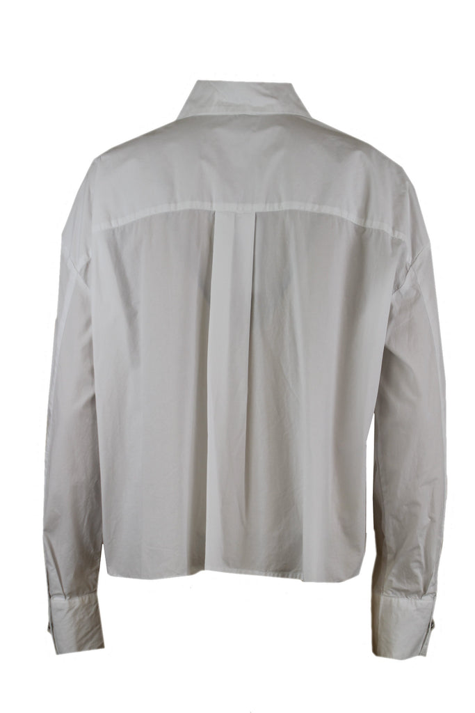Caroline Biss witte blouse, een blinde knoopsluiting en twee grote borstzakken aan de voorkant, mouwen met een manchet met een zilverkleurige knoop