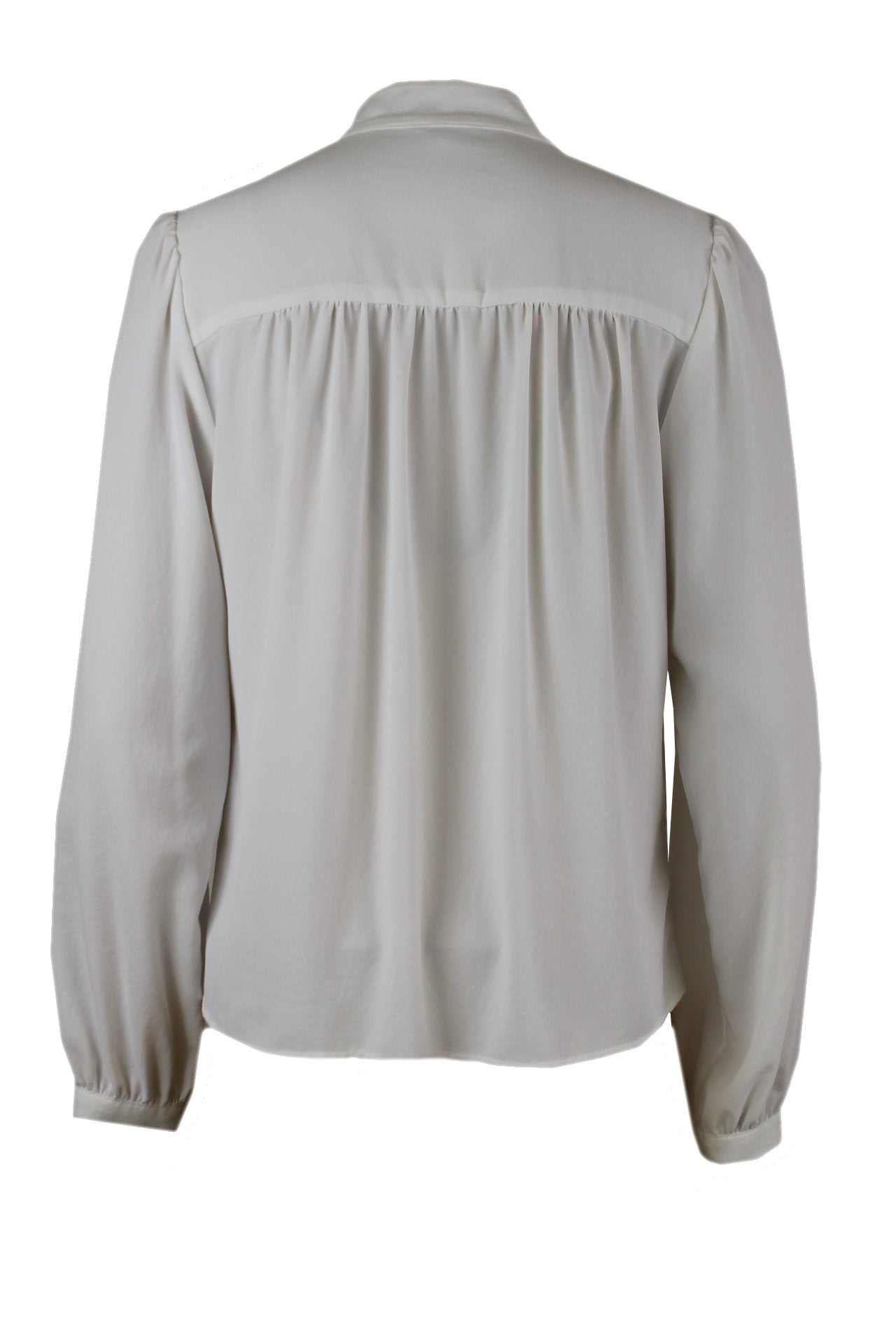 Caroline Biss offwhite blouse, een v-hals met een striksjaal, opgestikte schouders, ruime mouwen met een bies aan de onderkant