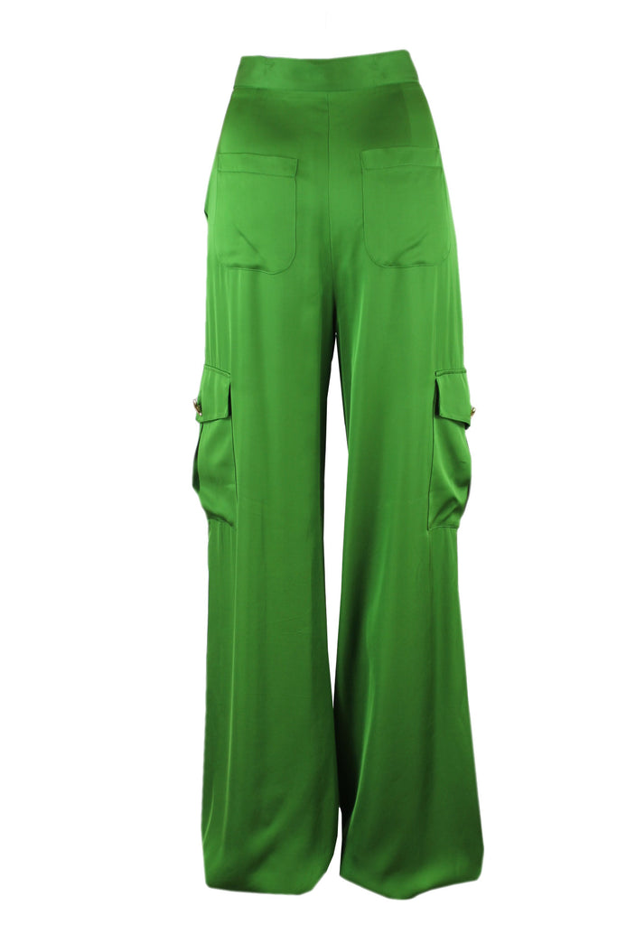 Caroline biss groene broek, rechte ruime pijpen met klepzakken, een rits met een goudkleurige luxe knoop, plooitjes voorkant, diverse zakken