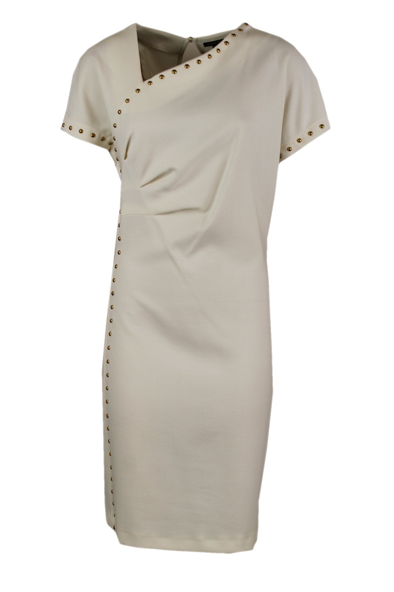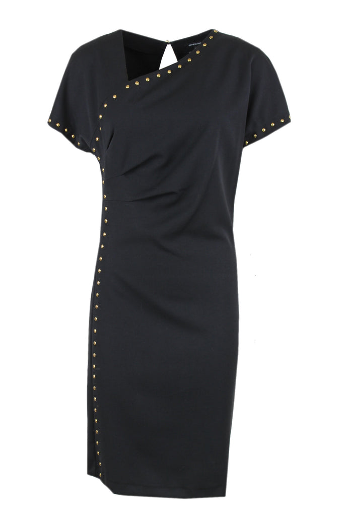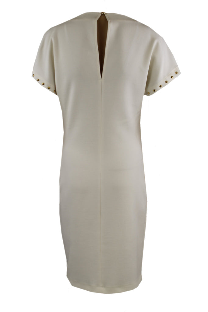 Caroline Biss luxueuze jurk met goudkleurige studs, aangeknipte ruime mouwen, een schuine v-hals met aan de achterkant een opening met een lusknoop, een rits aan de zijkant