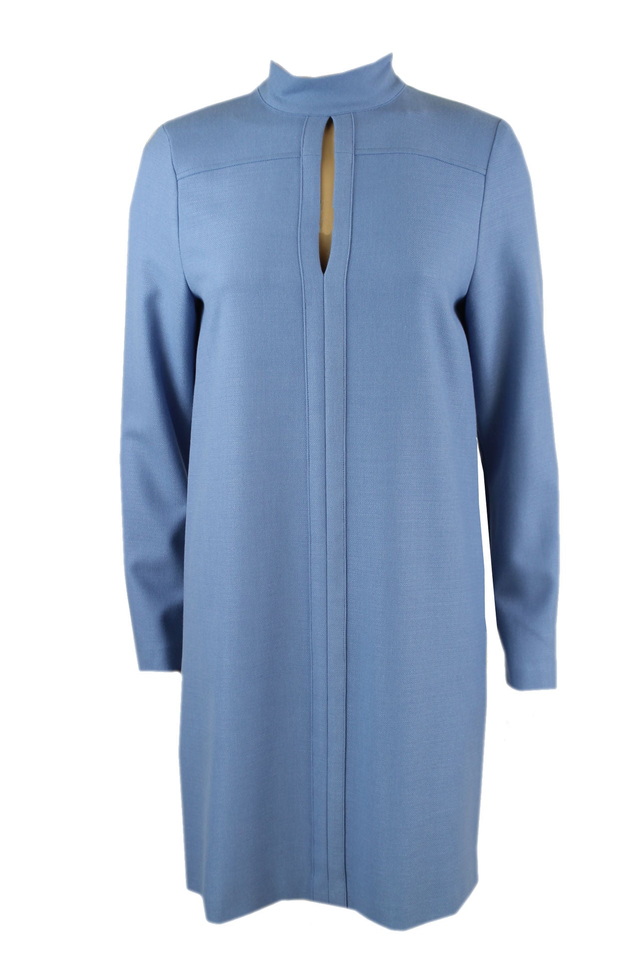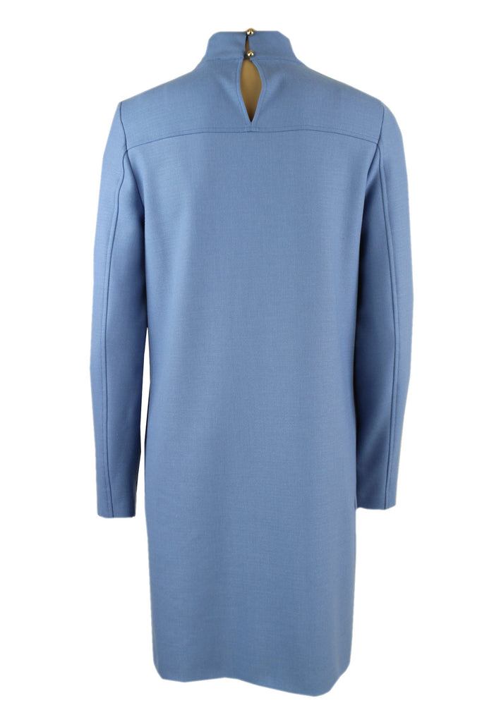 Caroline biss jurk, de hals heeft een stretch colletje met twee lusknoopjes aan de achterkant, de voorkant van de hals heeft een opening, steekzakken
