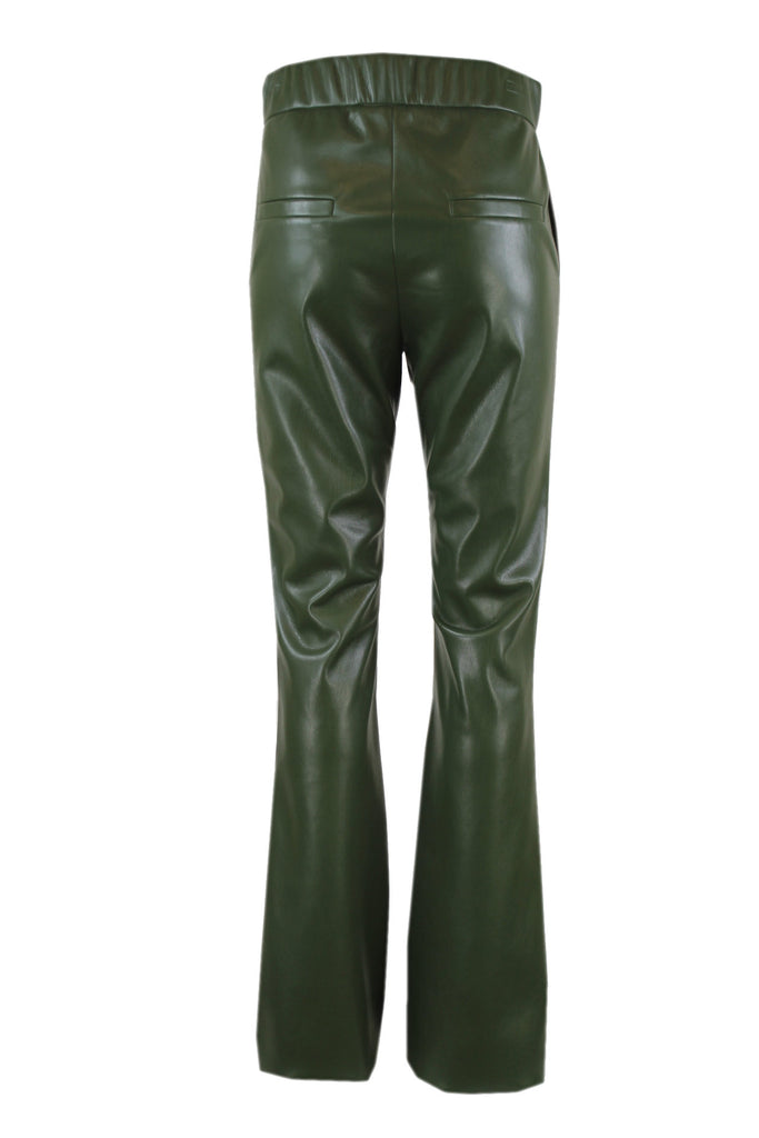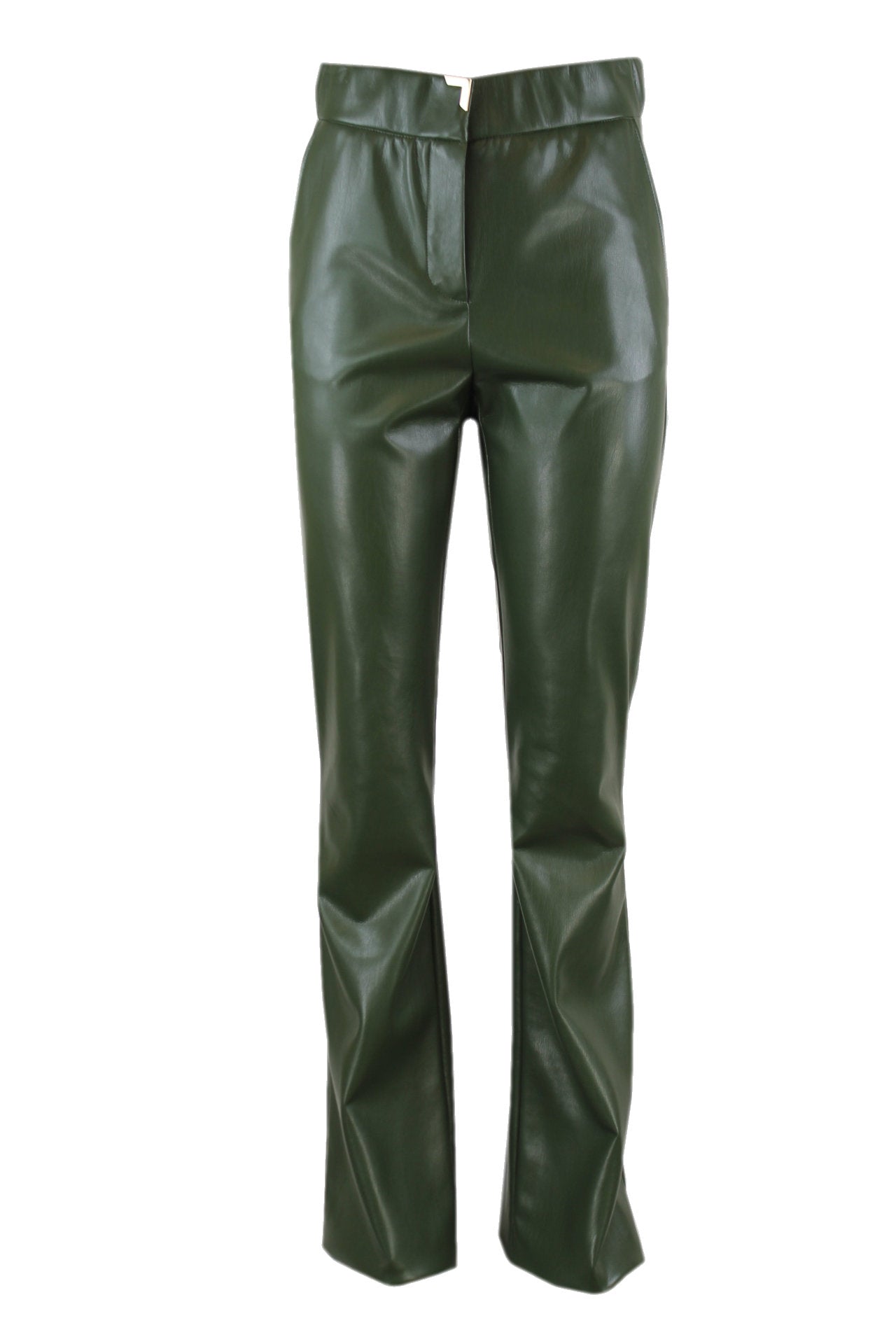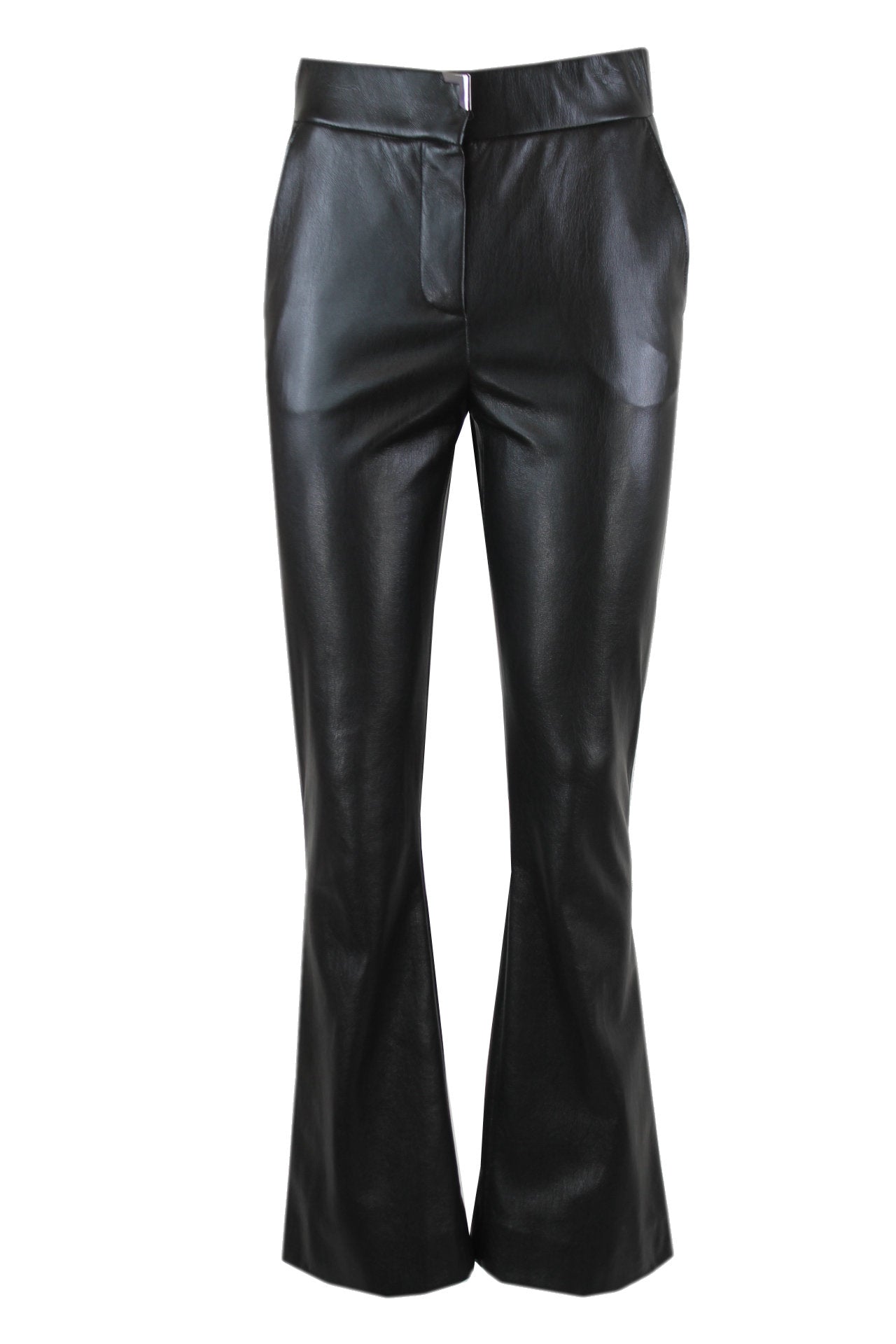 Caroline Biss leatherlook flared broek, een rits met een sluitknoop aan de voorkant met een siergesp, diverse zakken