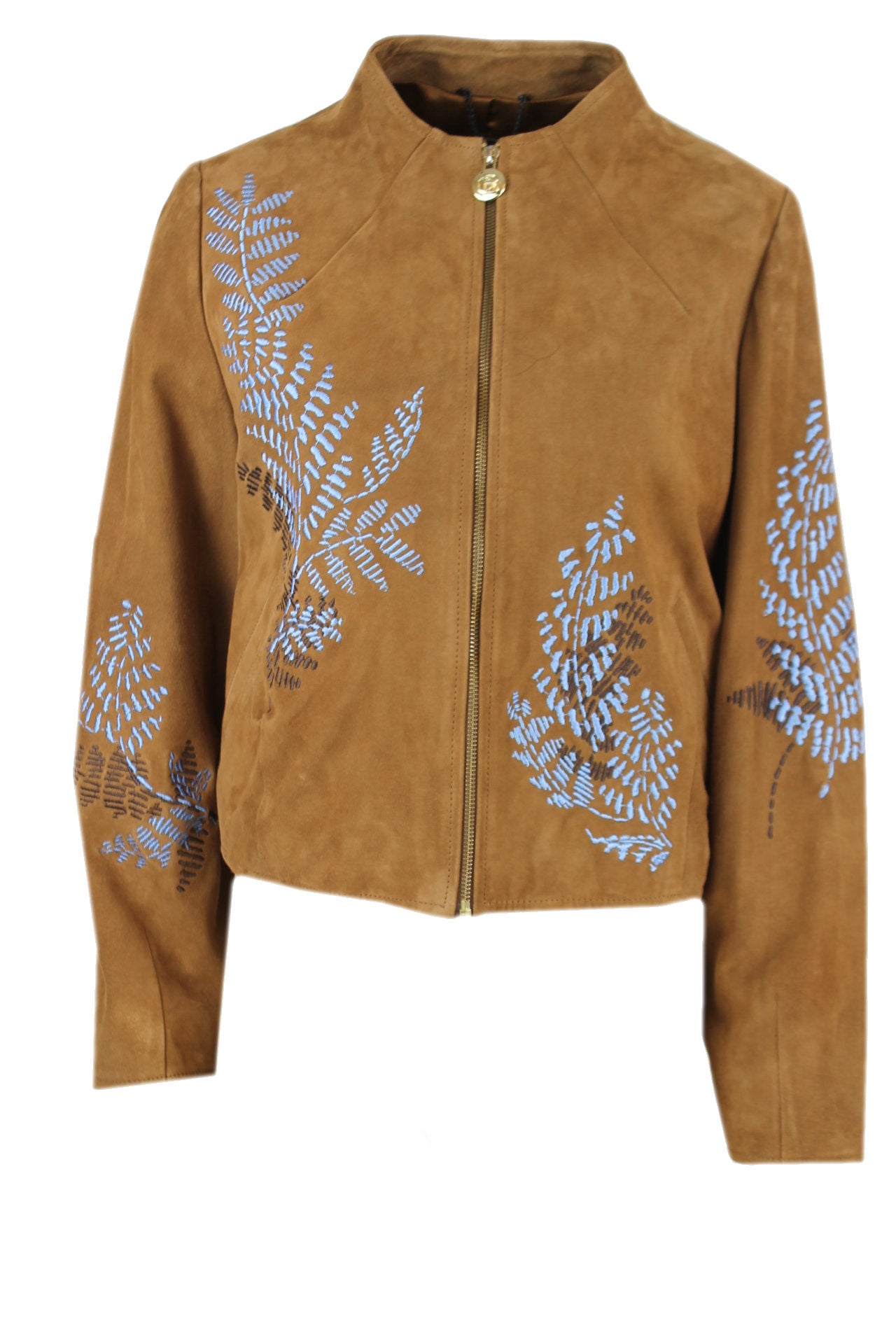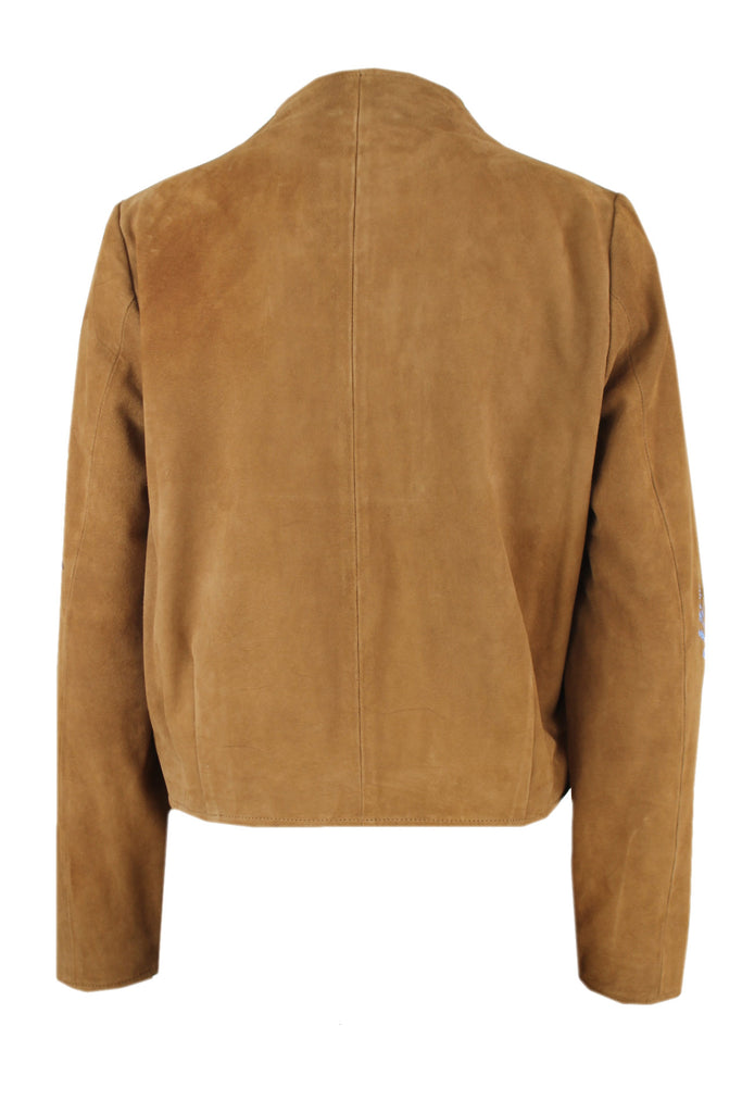 Caroline biss suède leren jasje, bruin met blauw/bruin geborduurd ontwerp, gevoerd, schuine paspelzakjes aan de voorkant