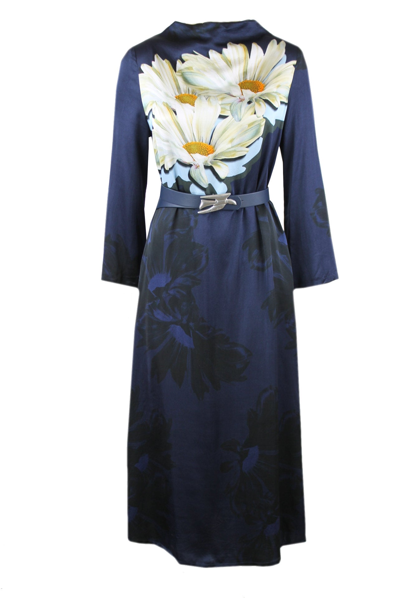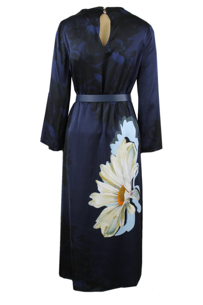 Caroline Biss donkerblauwe/zwarte jurk met een prachtige bloemprint aan de voor- en achterkant, een blauwe smalle riem met een luxe siergesp, ruime mouwen, steekzakken, hals heeft aan de achterkant een opening met een lusknoopje