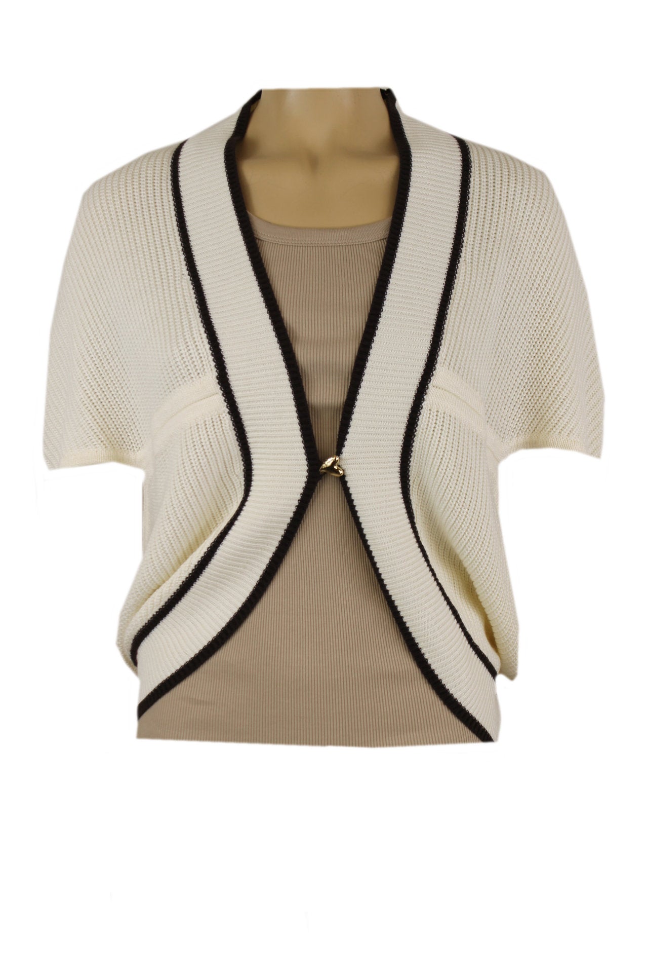 Caroline Biss crèmekleurig vest met bruine afwerking, een luxe goudkleurige knoop aan de voorkant