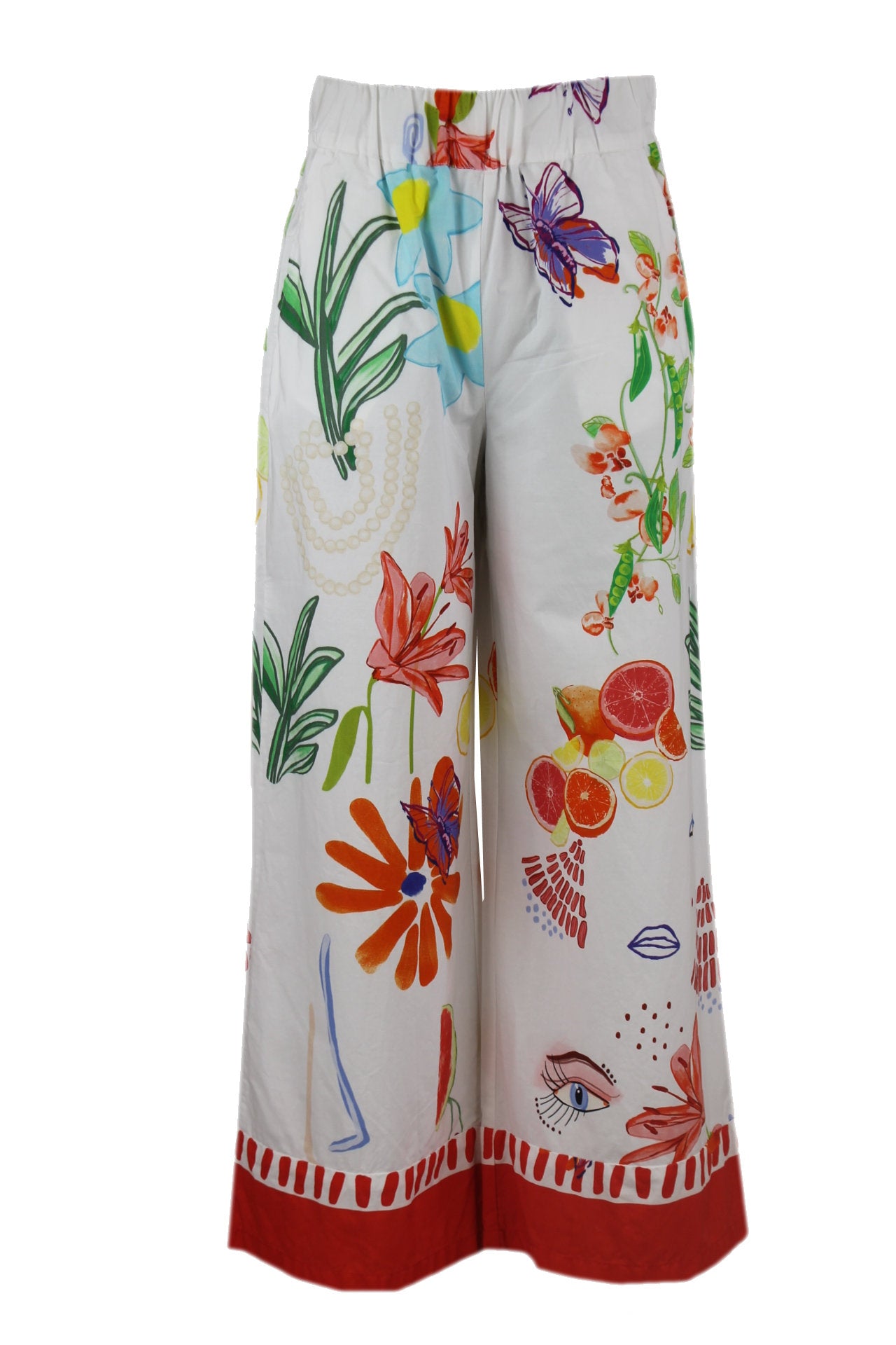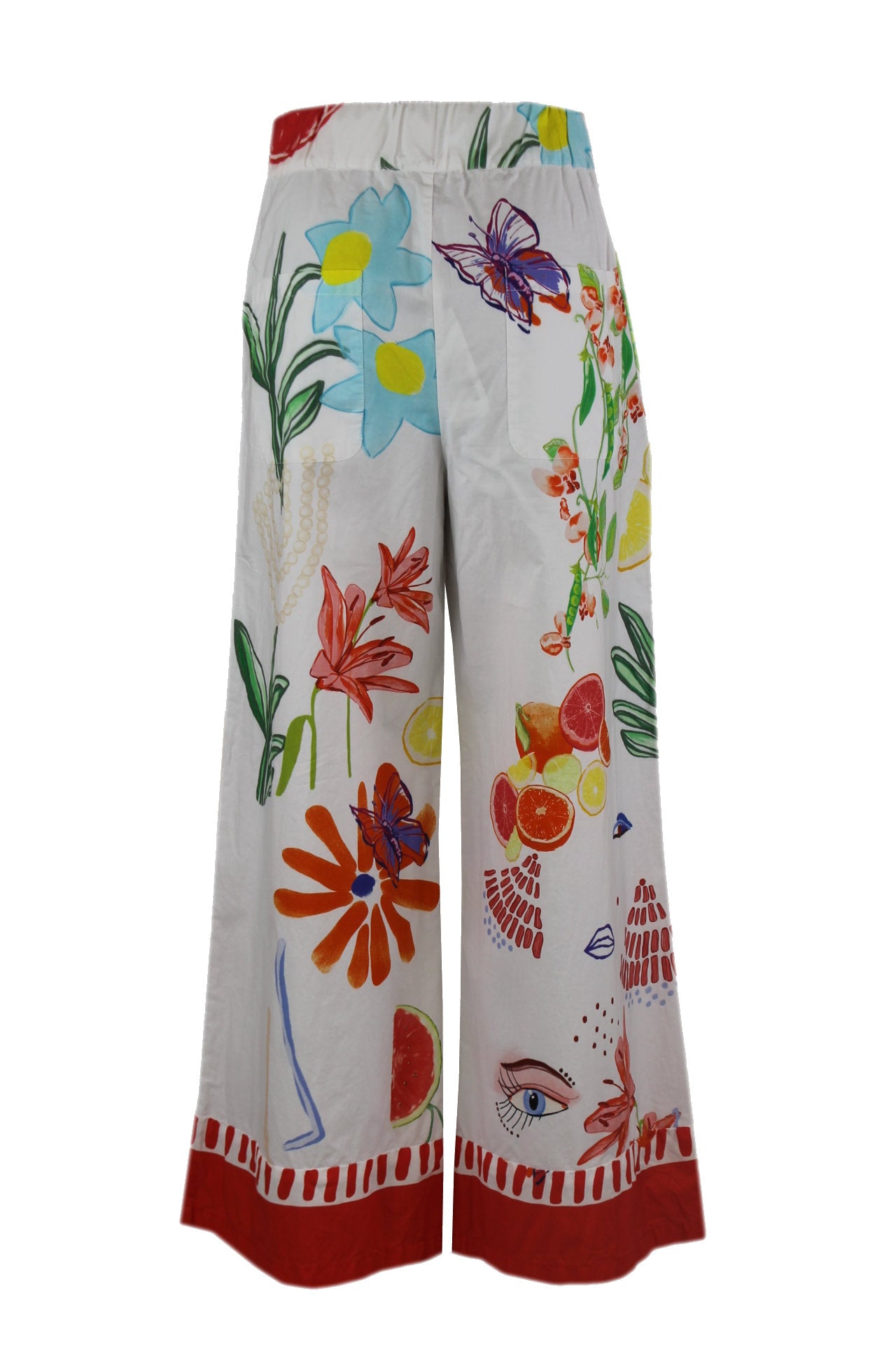 Caroline Biss witte broek met een bloemprint, rechte ruime pijpen, steekzakken, paspelzakken aan de achterkant