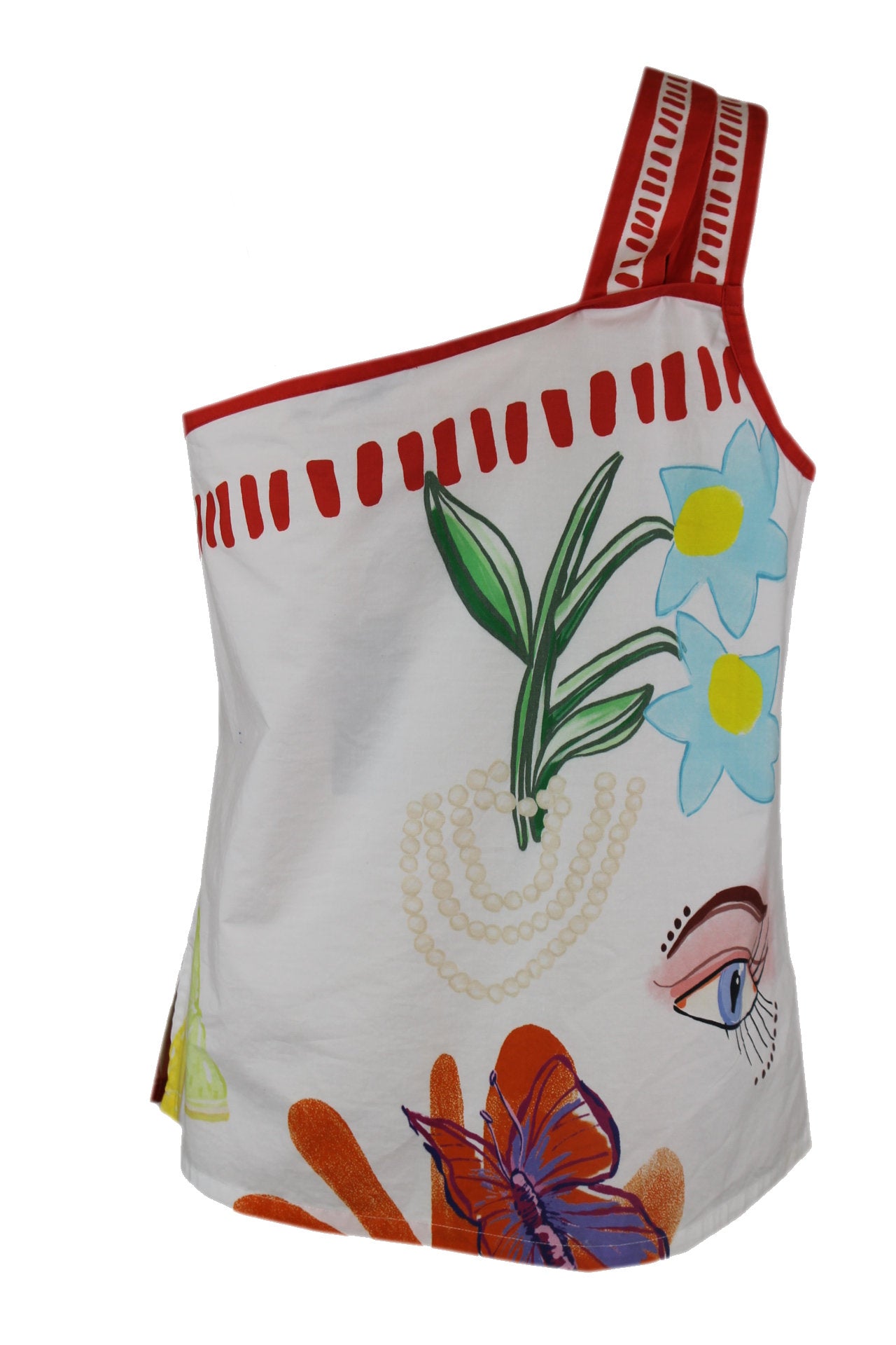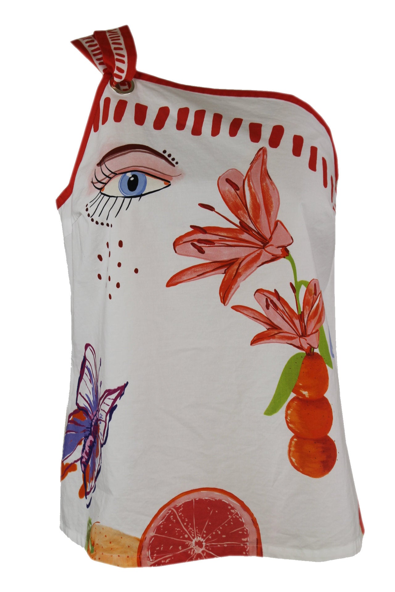 Caroline Biss witte luxe top met een bloemprint, een schuin gesneden hals met twee schouderbandjes