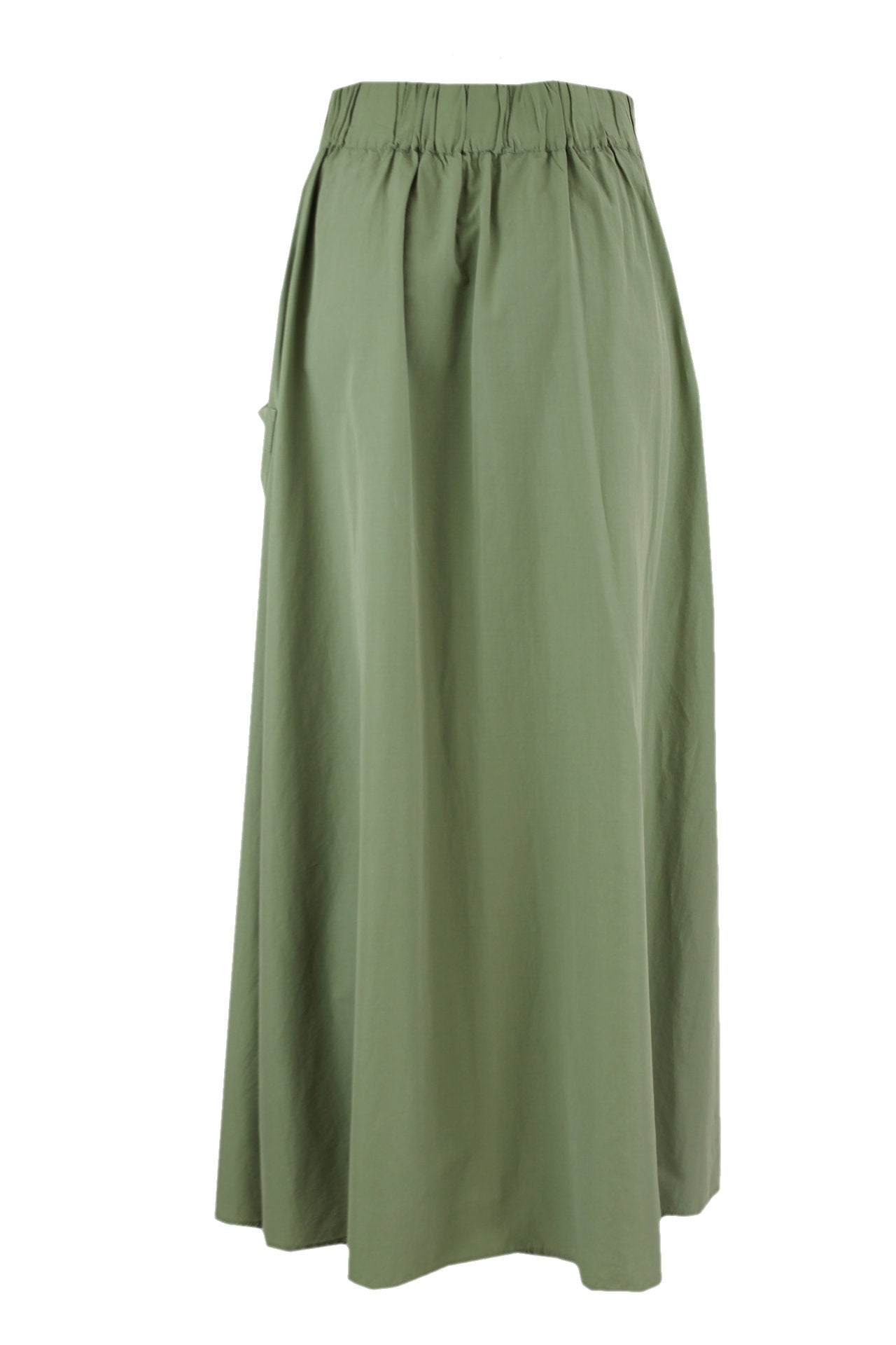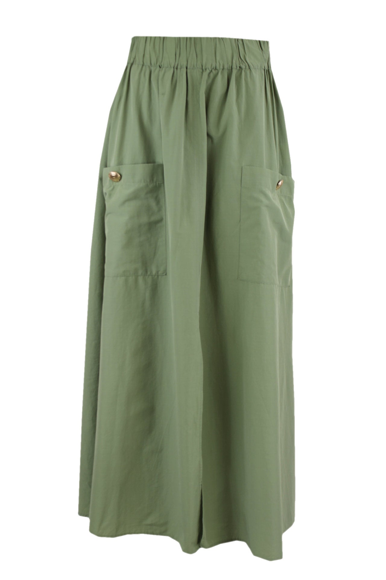 Caroline Biss groene geplooide rok, een split aan de voorkant, opgestikte zakken met een goudkleurige luxe knoop