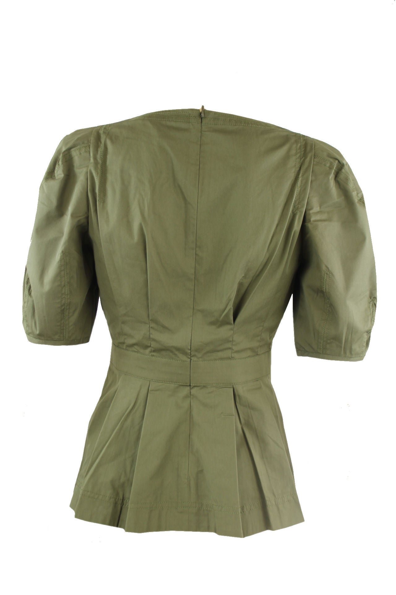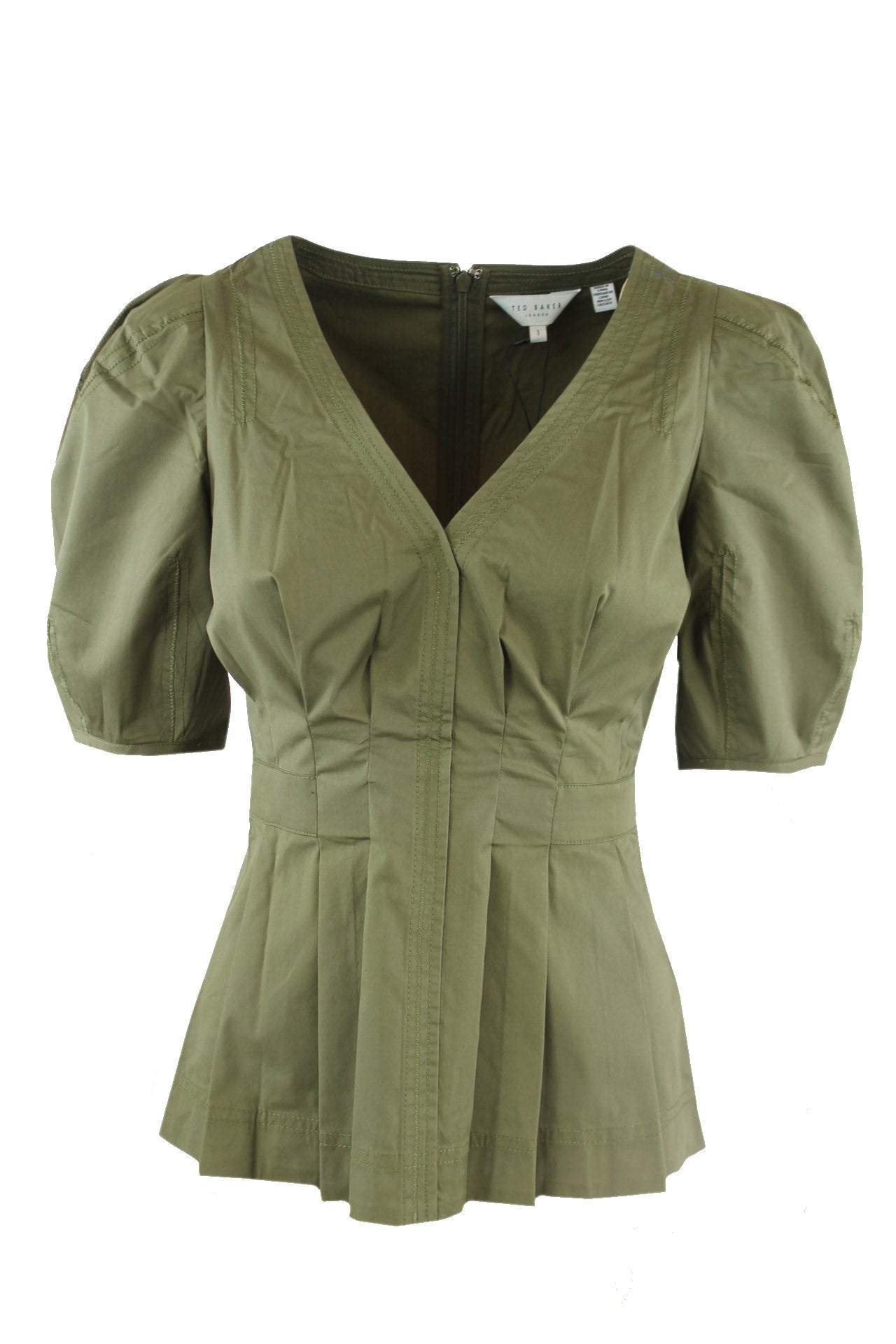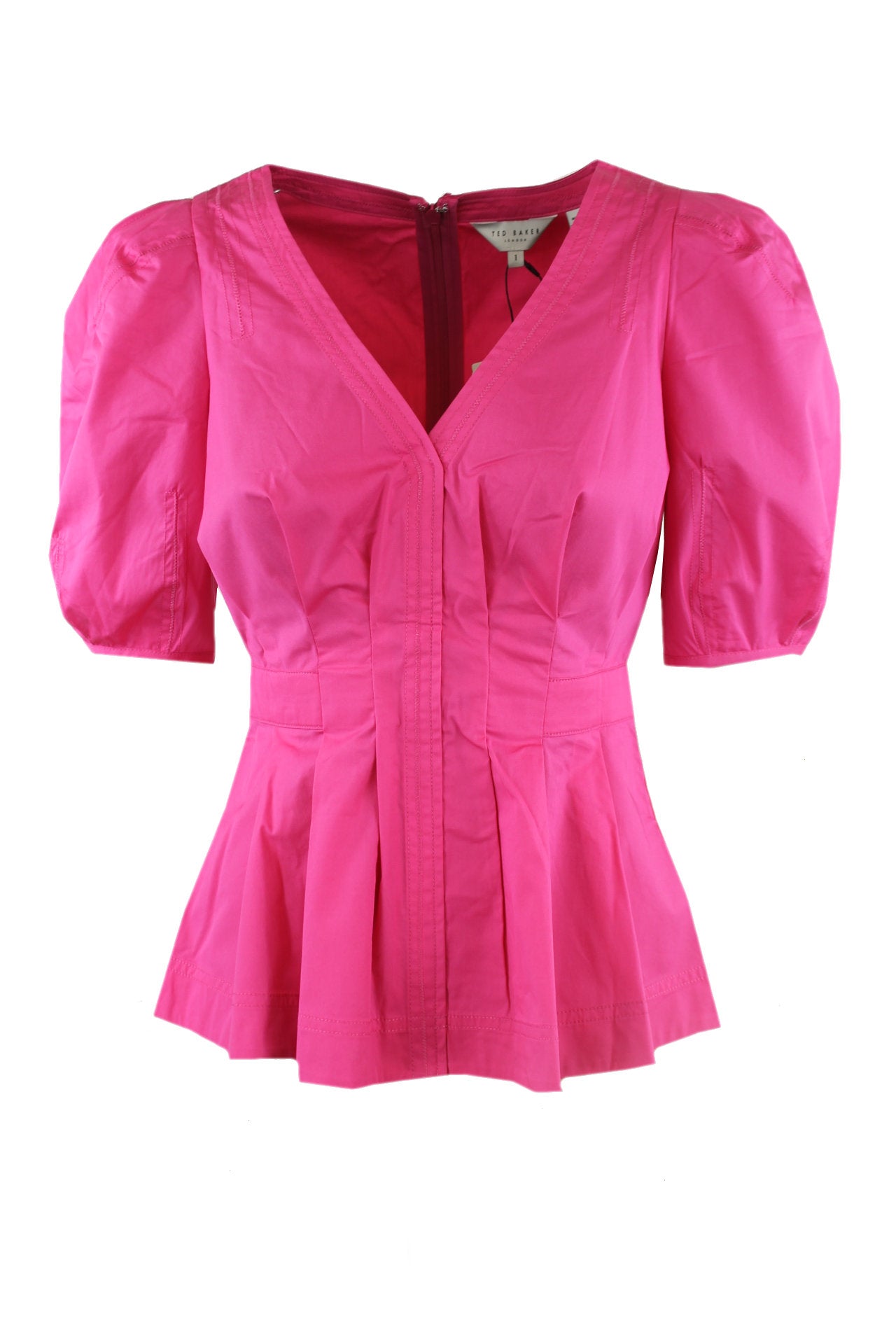 Ted Baker blouse, een lage v-hals, korte pofmouwen, een lange rits aan de achterkant, plooitjes voor en achter